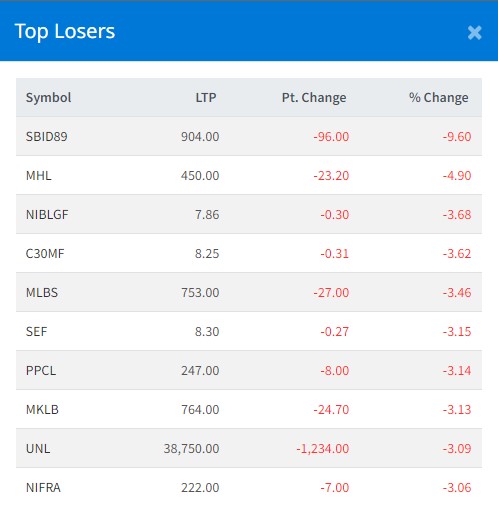 त्यसैगरी, सिटिजन सुपर ३० म्युचुअल फण्ड, मानुषि लघुवित्त, सिद्धार्थ इक्विटी फण्ड, पाँचथर पावर कम्पनी, मनकामना स्मार्ट लघुवित्त, यूनिलिभर नेपाल र निफ्राको शेयरमूल्य सर्वाधिक घटेको छ ।
