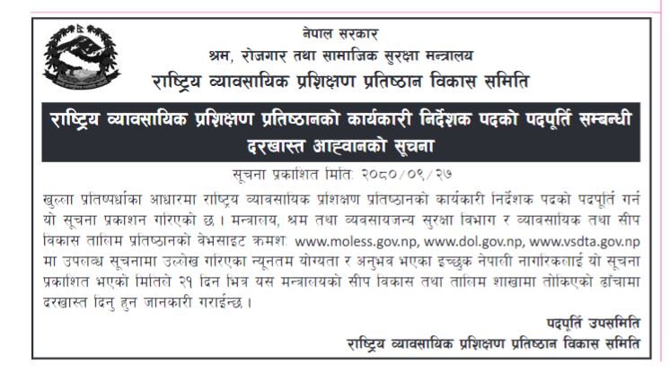 राष्ट्रिय व्यावसायिक प्रशिक्षण प्रतिष्ठानको कार्यकारी निर्देशकका लागि खुला दरखास्त (सूचनासहित)