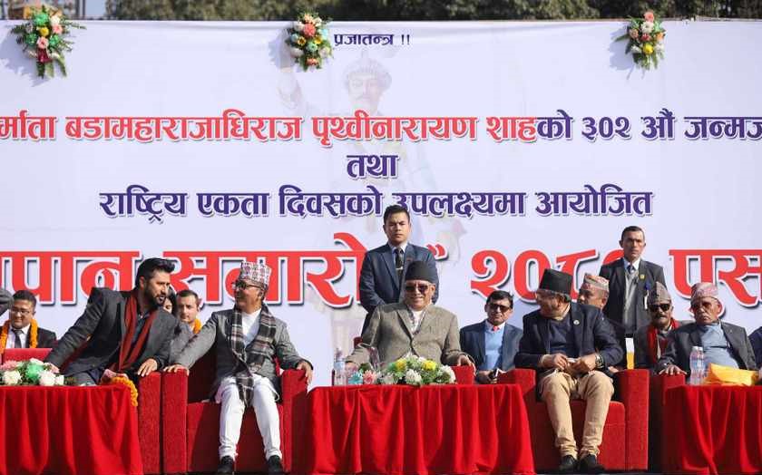 दुई राप्रपाको ‘जलपान–चियापान’मा सरिक भएर गणतान्त्रिक सरकारले पनि पृथ्वीजयन्ती मनाएको छ भने विहानै ‘हेड अफ् स्टेट’ राष्ट्रपति रामचन्द्र पौडेलले रामशाहपथ (सिंहदरबारको पश्चिमीगेट)मा रहेको पृथ्वीनारायण शाहको शालिकमा माल्यार्पण गरे । सबैले आ–आफ्नो औपचारिकता पूरा गरेर पृथ्वी जयन्ती मनाएका छन् ।