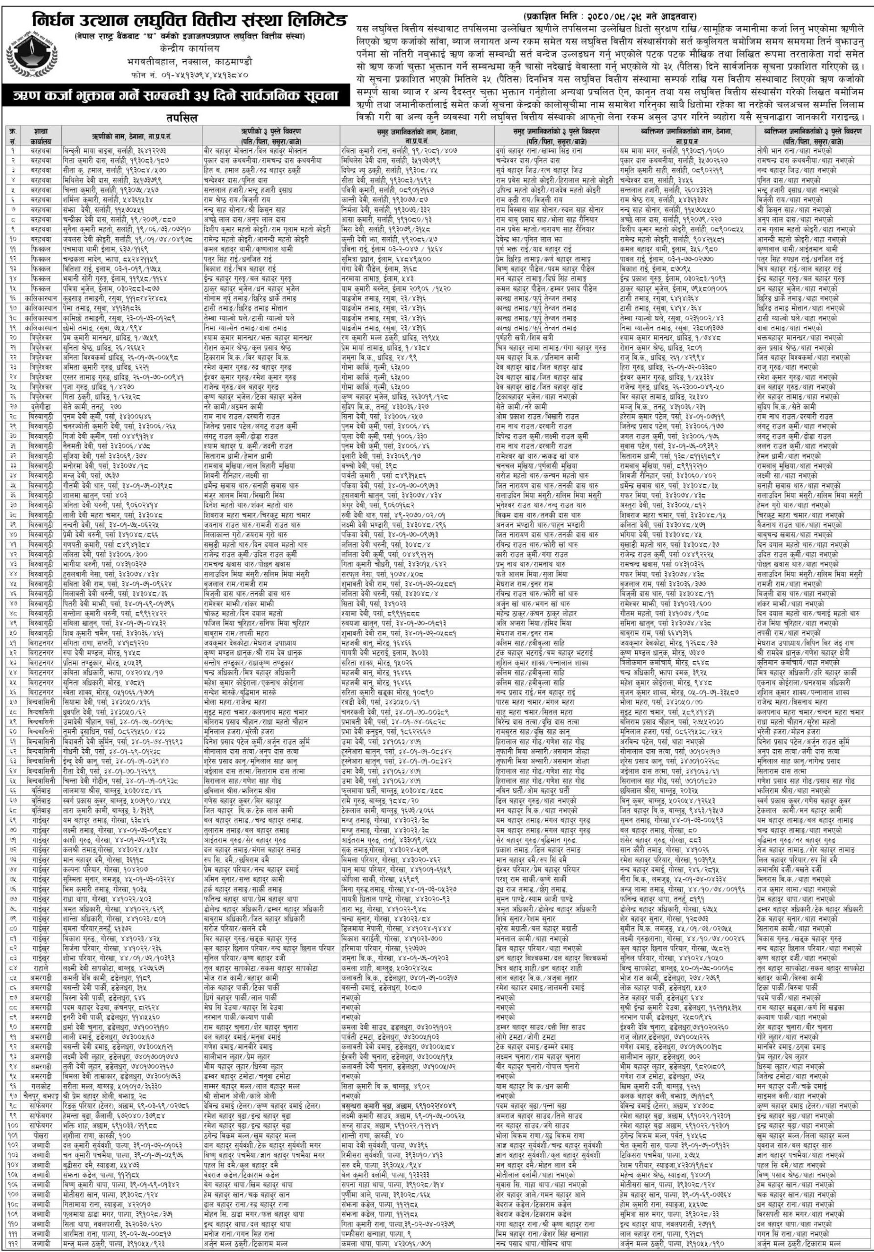 काठमाडौं । निर्धन उत्थान लघुवित्त वित्तिय संस्था लिमिटेडले ११२ ऋणीहरुलाई कर्जा चुक्ता गर्न आग्रह गर्दै सूचना निकालेको छ । कम्पनीले ३५ दिनको म्याद दिदै ऋण कर्जा भुक्तान गर्न आग्रह गरेको हो ।