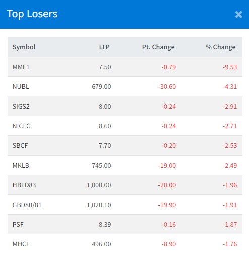 त्यसैगरी, मनकामना स्मार्ट लघुवित्त, १०% हिमालयन बैंक डिबेन्चर २०८३, १०.२५% ग्लोबल आइएमई बैंक डिबेन्चर २०८०।८१, प्रभु सेलेक्ट फण्ड र मोलुङ हाइड्रोपावरको शेयरमूल्य सर्वाधिक घटेको हो ।