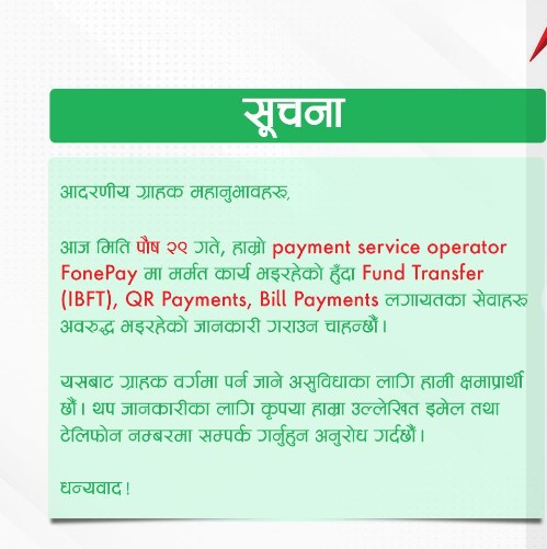 यसबाट ग्राहकलाई पर्ने जाने असुविधाको लागि कम्पनीले क्षमा मागेको छ । साथै केही जानकारी चाहे बैंकको सम्र्पक नम्बरमा कल गर्न बैंकले आग्रह गरेको छ ।