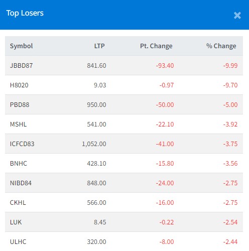यस दिन ज्योति विकास बैंक बोण्ड २०८७, हिमालयन ८०–२० र १०% प्राइम डेबेन्चर २०८८ को शेयरमूल्यमा चर्काे गिरावट आएको छ । यस कम्पनीहरुको शेयरमूलय क्रमश ९.९९, ९.७० र ५ प्रतिशतले शेयरमूल्य घटेको हो ।