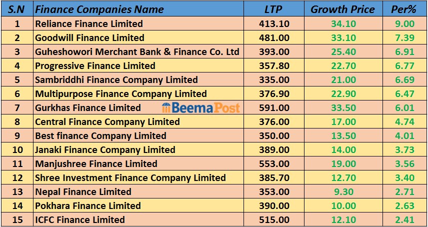 नेप्से दोहोरो अंकले बढ्दा फाइनान्स उपसूचकमा उछाल, कुन कम्पनीको शेयरमूल्य कति? (एलटीपीसहित)
