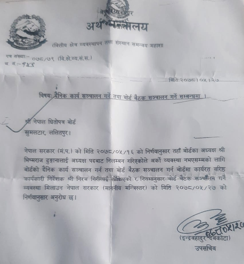 स्रोतले जनाए अनुसार केही दिन पहिले कार्यकारी निर्देशक कृष्ण पोखरेलले आफूले दैनिक कार्य सञ्चालन र बोर्ड बैठक बोलाउन पाउनुपर्ने भन्दै निवेदन लिएर अर्थ सचिव कृष्णहरि पुस्करको कार्यकक्षमा पुगेका थिए । बोर्डका चौथो तहमा रहेको कर्मचारी कामु अध्यक्षको जिम्मेवारी पाउन माग गर्दै निवेदन बोकेर आएपछि आश्चर्यमा परेका सचिव पुस्करले फर्काइदिएका थिए ।
