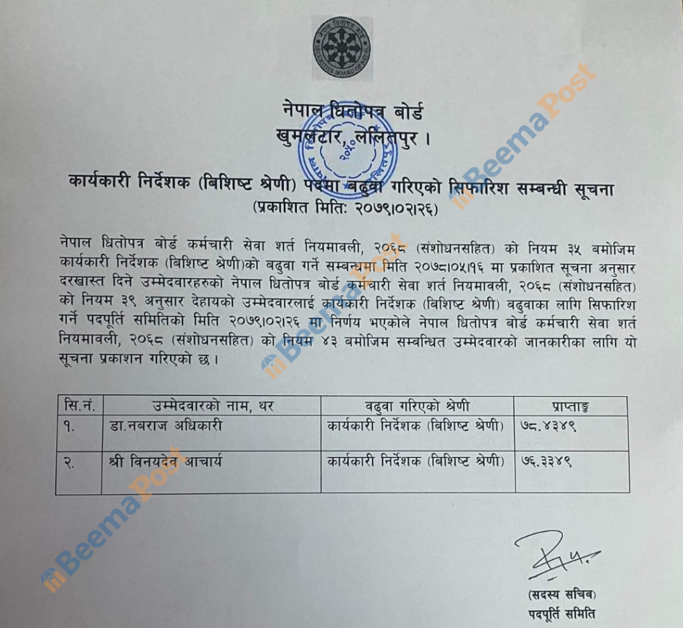 तर, बीमापोष्टलाई प्राप्त कागजातमा बोर्डका सबैभन्दा सिनियर कार्यकारी निर्देशकको रुपमा डा. नबराज अधिकारीको नाम भएको तथ्य फेला परेको छ । २०७९ जेठ २६ गते नेपाल धितोपत्र बोर्डमा विशिष्ट श्रेणीमा बढुवा हुँदा डा. अधिकारीले ७८.४३४९ र अर्का कार्यकारी निर्देशक बिनयदेव आचार्यले ७६.३३४९ अंक प्राप्त गरेका थिए । सो आधारमा कार्यकारी निर्देशक डा. अधिकारी नै सबैभन्दा सिनियर भए पनि धितोपत्र बोर्डमा अनुशासनहिन तरिकाले तल्ला तहका कर्मचारीहरुले आफूले कामु अध्यक्षको जिम्मेवारी पाउनु पर्ने भन्दै निवेदन बोकेर अर्थ मन्त्रालयको चोटाकोठा चहारिरहेका छन् ।
