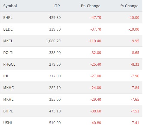 त्यस्तै, मुक्तिनाथ कृषि कम्पनीको शेयरमूल्य ९.९५ प्रतिशतले घटेको छ । आज डोल्टी पावर, राप्ती हाइ«डो एण्ड जनरल, इन्ग्वा हाइड्रोपावर, माया खोला हाइड्रोपावर, माई खोला हाइड्रोपावर, बाराही हाइड्रोपावर र अपर स्याङ्गे हाइड्रोपावरको शेयरमूल्य सर्वाधिक घटेको छ ।