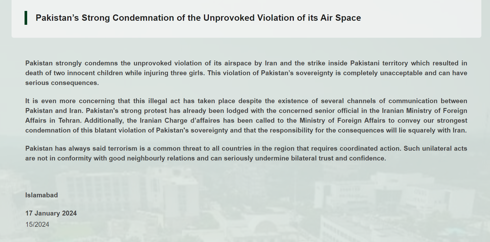 उता, पाकिस्तानी विदेश मन्त्रालयले आजै साँझ प्रेस बिज्ञप्ति प्रकाशित गरेर आफ्नो भूमिमा भएको मिसाईल हमला कुनै पनि प्रकारले स्वीकार गर्न नसकिने बताउँदै यसले गम्भिर परिस्थिति निम्त्याउन सक्ने चेतावनी दिएको छ । पाकिस्तानी विदेश मन्त्रालयले आजै साँझ जारी गरेको बिज्ञप्तिमा इरानले पाकिस्तानी एयरप्लेस उल्लंघन गरेको आरोप लगाएको छ । साथै आजै साँझ जारी अर्को बिज्ञप्तिमा दुई देशका परराष्ट्र मन्त्रीहरुका बीचमा टेलिफोन संवाद भएको उल्लेख गरेको छ ।