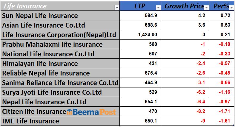बिहिबार जीवन बीमा सेक्टरबाट १२ सूचीकृत कम्पनीहरु कारोबारमा आएका थिए । जसमध्ये ३ कम्पनीहरुको शेयरमूल्य बढ्यो भने बाँकीका ९ कम्पनीहरुको शेयरमूल्य घटेको छ ।