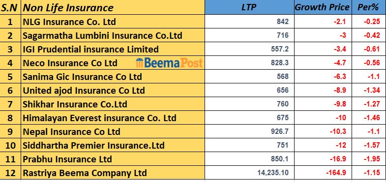 आज निर्जीवन बीमा सेक्टरबाट कुल १२ सूचीकृत कम्पनीहरु कारोबारमा आएका थिए । जसमध्ये १२ वटै कम्पनीको सेयर मूल्य ओरालो लागेको हो । यस दिन सर्वाधिक राष्ट्रिय बीमा कम्पनीको सेयर मूल्य घटेको छ । कम्पनीको सेयर प्रतिकित्ता १६४ रुपैयाँ ९ पैसाले घटेको हो ।