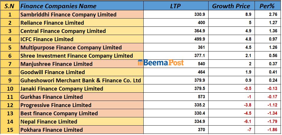 आज कारोबारमा आएका १५ फाइनान्स कम्पनी मध्य ९ कम्पनीको मूल्य बढेको छ भने ६ कम्पनीको मूल्य ओरालो लागेको हो ।