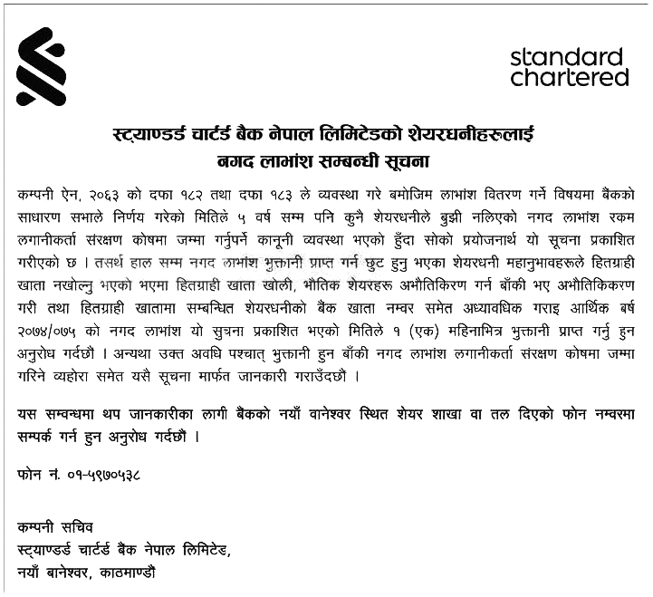 काठमाडौं । स्ट्याण्डर्ड चार्टर्ड बैंक नेपाल लिमिटेडले आफ्ना शेयरधनीलाई पुरानो नगद लाभांश बुझिलिन आग्रह गरेको छ।