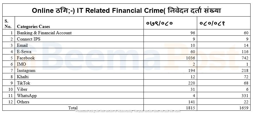 आईटीका माध्यमबाट हुने वित्तीय अपराध समेत बढ्दै गएको तथ्याङ पनि साइबर ब्युरोले संकलन गरेको छ । चालु आर्थिक वर्षको ६ महिनामा आईटीसम्बन्धी वित्तीय अपराधका १ हजार ६५९ वटा उजुरी साइबर ब्युरोमा परेका छन् । ब्युरोमा बैंक तथा वित्तीय एकाउन्ट सम्बन्धी ६० वटा उजुरी परेको छ । जहाँ गत आर्थिक वर्षको १२ महिनामा ९६ निवेदन दर्ता भएका थिए ।