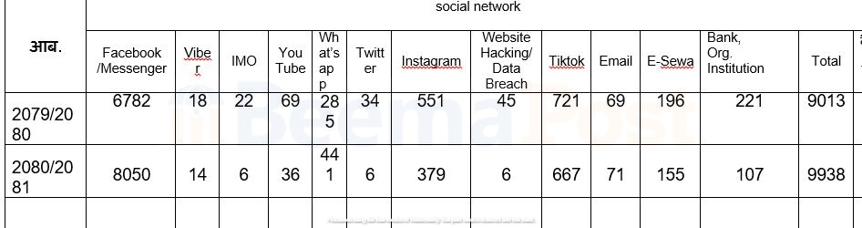 चालु आर्थिक वर्षको ६ महिनामा साइबर ब्युरोमा ९ हजार ९३८ उजुरी सामाजिक सञ्जालमार्फत भएका अपराधलाई लिएर परेका प्रहरी वरिष्ठ उपरीक्षक तथा सूचना अधिकारी नबिन्द अर्यालले बताए ।