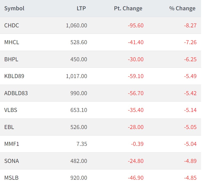 आज बाराही हाइड्रोपावर, ११% केबिएल डेबेन्चर २०८९, १०.५३% एग्रिकल्चर बैंक डेबेन्चर २०८३, विजय लघुवित्त, एभरेष्ट बैंक, मेघा म्युचुअल फण्ड–१, सोनापुर मिनरल्स एण्ड आयल र महुली लघुवित्तको शेयरमूल्य सर्वाधिक घटेको छ ।