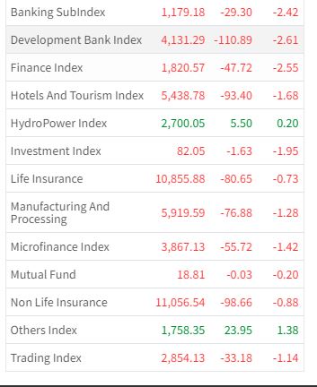 बजार ओरालो लागेसँगै ११ उपसूचक राताम्य भएका छन् । आज बैंकिङ समूहको २.४२ प्रतिशत, विकास बैंक समूहको २.६१ प्रतिशत, फाइनान्स समूहको २.५५ प्रतिशतले सेयर मूल्य ओरालो लागेको छ ।