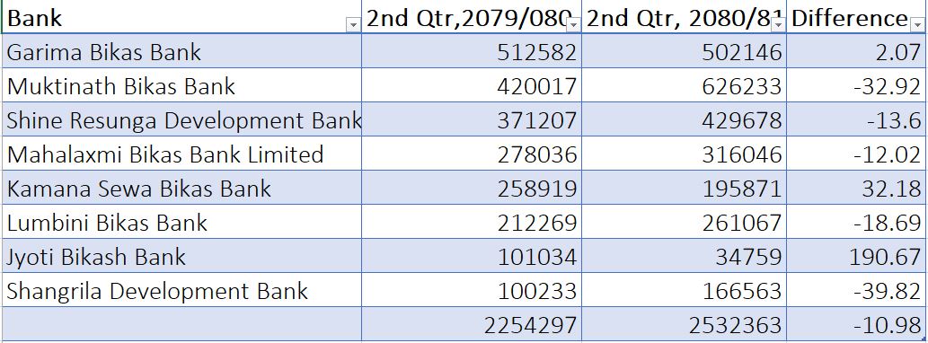 त्यस्तै, महालक्ष्मी विकास बैंकको मुनाफा १२.०२ प्रतिशतले घटेर २७ करोड ८० लाख ३६ हजार रुपैयाँ, कामना सेवा विकास बैंकको नाफा ३२.१८ प्रतिशतले बढेर २५ करोड ८९ लाख रुपैयाँ, लुम्बिनी विकास बैंकको नाफा १८.६९ प्रतिशतले घटेर २१ करोड २२ लाख ६९ हजार रुपैयाँ, ज्योति विकास बैंकको नाफा १९०.६७ प्रतिशतले बढेर १० करोड १० लाख रुपैयाँ र सांग्रिला डेभलपमेन्ट बैंकको नाफा ३९.८२ प्रतिशतले घटेर १० करोड २ लाख ३३ हजार रुपैयाँ रहेको छ ।