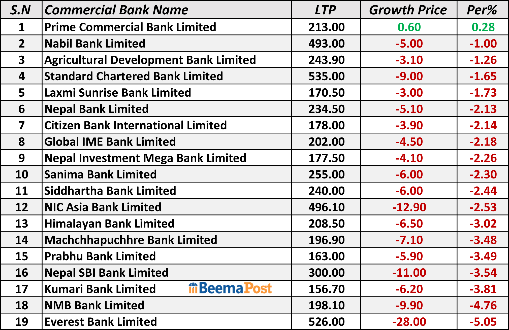 यस दिन वाणिज्य बैंक उपसूचक २.४२ प्रतिशतले ओरालो लागेको छ । आज नेप्सेमा सूचीकृत कुल १९ वाणिज्य बैंकहरु कारोबारमा आएका थिए । जसमध्ये १८ वटा बैंकहरुको शेयरमूल्य घट्दा एकमात्र प्राइम कमर्सियल बैंकको शेयरमूल्य ०.२८ प्रतिशतले बढेको हो ।