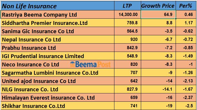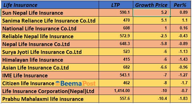 यस दिन निर्जीवन बीमा सेक्टरबाट कुल १२ सूचीकृत कम्पनीहरु कारोबारमा आएका थिए । जसमध्ये २ कम्पनीको शेयरमूल्य बढ्दा १० को घट्यो हो ।