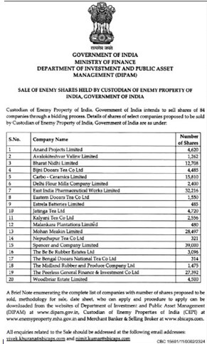 सरकारले ८४ कम्पनीको २,९१,५३६ शेयर ‘‘कस्टोडियन अफ एनिमी प्रोपर्टीज फर इण्डिया’’ (सीईपीआई)को स्वामित्वमा छ ।