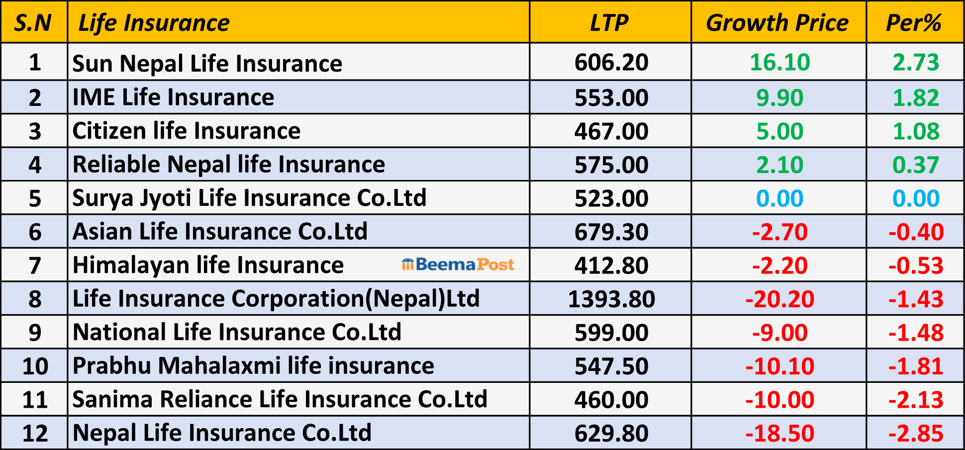 आज सन नेपाल लाइफको शेयरमूल्य सर्वाधिक २.७३ प्रतिशतले बढेको छ । नेपाल लाइफ इन्स्योरेन्स र सानिमा रिलायन्स लाइफको शेयरमूल्य सर्वाधिक घटेको छ।