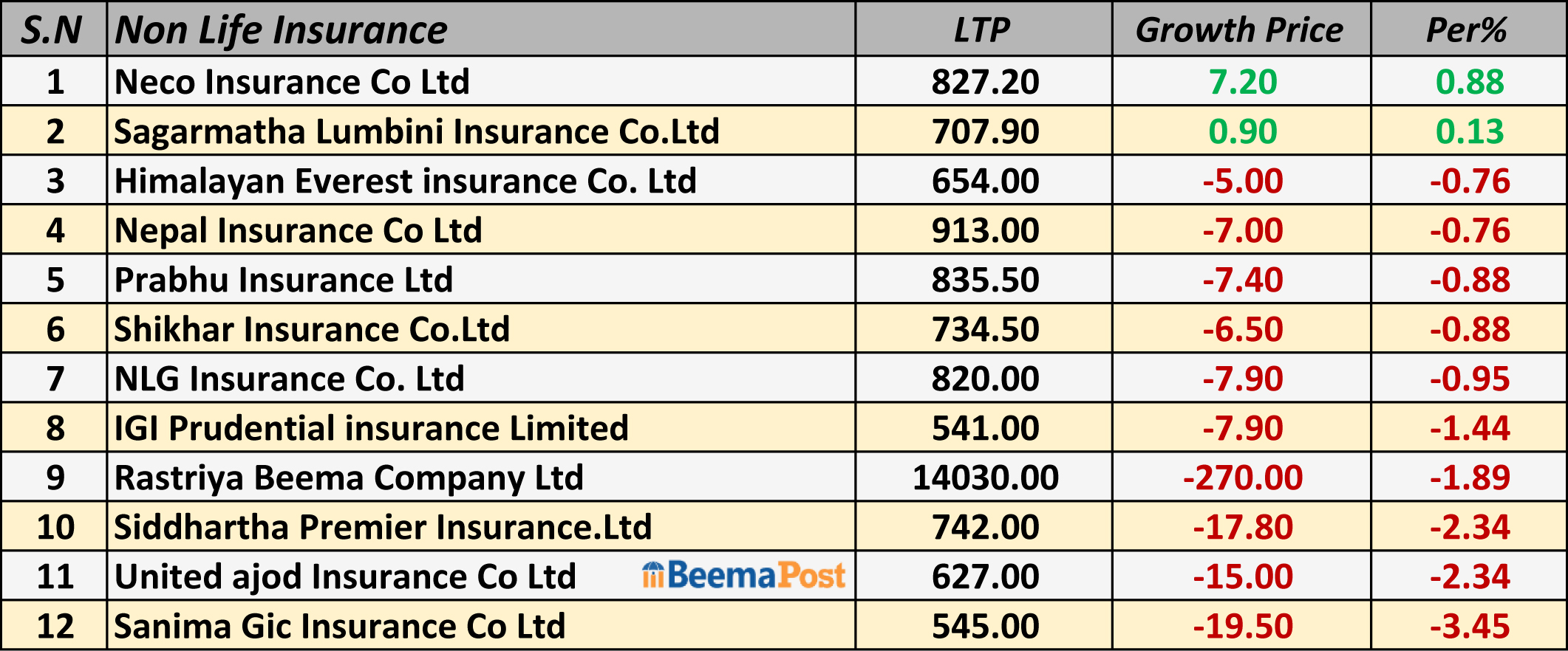 जसमध्ये १० कम्पनीहरुको शेयरमूल्य घट्यो भने दुई कम्पनीहरुको शेयरमूल्य भने बढेको छ । आज नेको इन्स्योरेन्स र सगरमाथा लुम्बिनी इन्स्योरेन्सको शेयरमूल्य बढेको हो।
