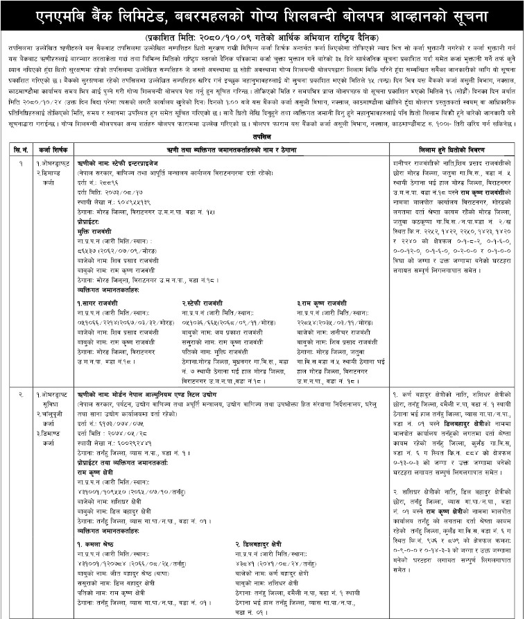 बैंकले ऋणीहरुको धितो सुरक्षणमा रहेको उल्लेखित सम्पत्तिहरु जे–जस्तो अवस्थामा छ सोही अवस्थामा गोप्य शिलबन्दी बोलपत्रद्वारा बिक्री गरिने जनाएको हो ।