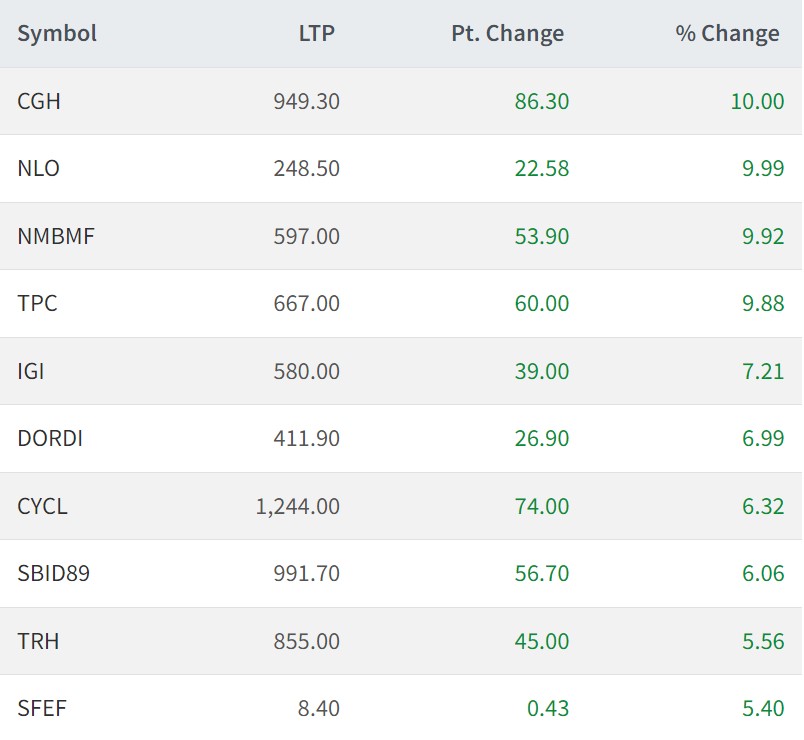 त्यसैगरी, दोर्दी खोला जल विद्युत, सीवाईसी नेपाल लघुवित्त, ९% नेपाल एसबिआई बैंक ऋणपत्र २०८९, तारागाँउ रिजेन्सी र सनराइज फोकस्ड इक्विटी फण्डको शेयरमूल्य सर्वाधिक बढेको छ ।
