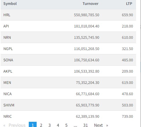 त्यस्तै, अपी पावर, एनआरएन इन्फ्रास्क्चर, नाग्दी पावर, अरुण काबेली, सोनापुर मिनरल, माउन्टेन इनर्जी, एनआईसी एशिया बैंक, शिवम सिमेन्टस र नेपाल रिको सर्वाधिक कारोबार भएको छ ।