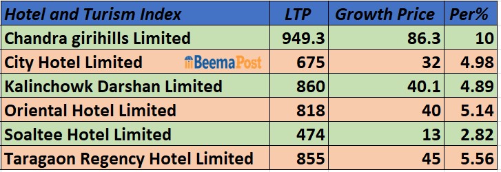 होटल समूहमा उछाल आँउदा कुन कम्पनीको शेयर मूल्य कतिले बढ्यो? (एलटिपी सहित)