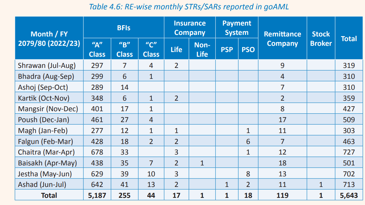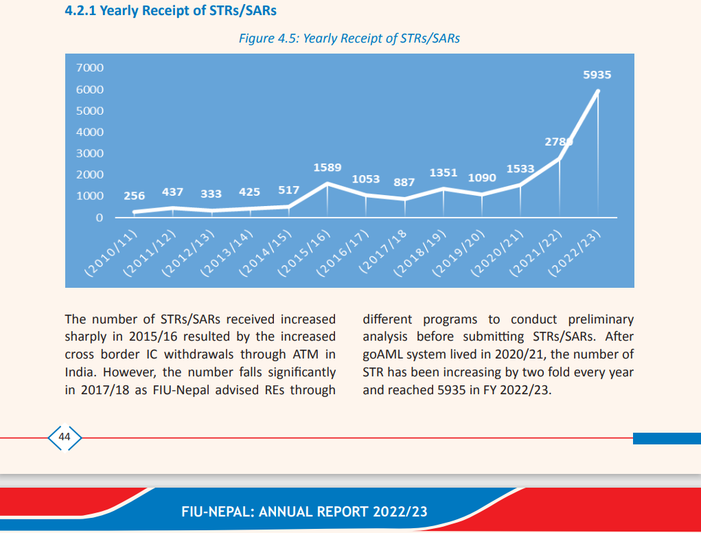 गत आवमा नेपालका बैंक तथा वित्तीय संस्था, बीमा कम्पनी र अन्य सरकारी एजेन्सी समेत गरी कूल पाँच हजार आठ सय ३७ वटा शंकास्पद कारोबार रिपोर्ट वित्तीय अनुसन्धान ईकाईमा पुगेको थियो । त्यस्तै, अघिल्लो वर्षमा जम्मा दुई हजार आठ सय ८० वटा मात्रै रिपोर्ट केन्द्रीय बैंकमा पुगेको थियो ।