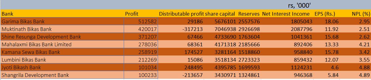 त्यस्तै, वितरणयोग्य नाफामा गरिमा विकास बैंकको २ करोड ९१ लाख रुपैयाँ, शाइन रेसुङ्गाको ६ करोड ७४ लाख रुपैयाँ, महालक्ष्मी विकास बैंकको ६ करोड ८३ लाख रुपैयाँ, कामना सेवा विकास बैंकको १७ करोड ४५ लाख रुपैयाँ, लुम्बिनी विकास बैंकको १ करोड ५० लाख रुपैयाँ र ज्योति विकास बैंकको २४ करोड ८४ लाख रुपैयाँ रहेको छ ।