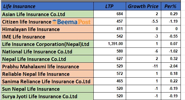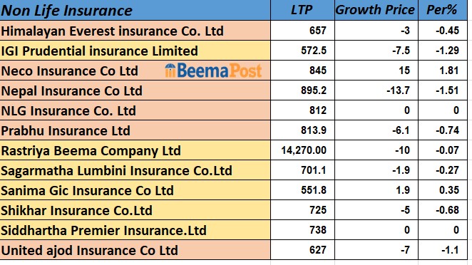 सुचिकृत २४ वटा जीवन र निर्जीवन बीमा कम्पनीहरुमध्ये १४ वटाको भाउ घटेको छ । त्यसैगरी ७ वटाको भाउ बढ्दा ३ वटा कम्पनीको भाउ यथावत रहेको छ । जीवनतर्फ ५ वटाको मूल्य बढ्दा ६ वटाको मूल्य घटेको छ । यस समुह तर्फ एउटा कम्पनीको शेयर भाउ स्थिर छ। यता निर्जीवन बीमा तर्फ २ वटाको भाउ बढ्दा ८ वटा कम्पनीको भाउ घटेको छ भने २ वटाको शेयर भाउ यथावत रहेको छ ।