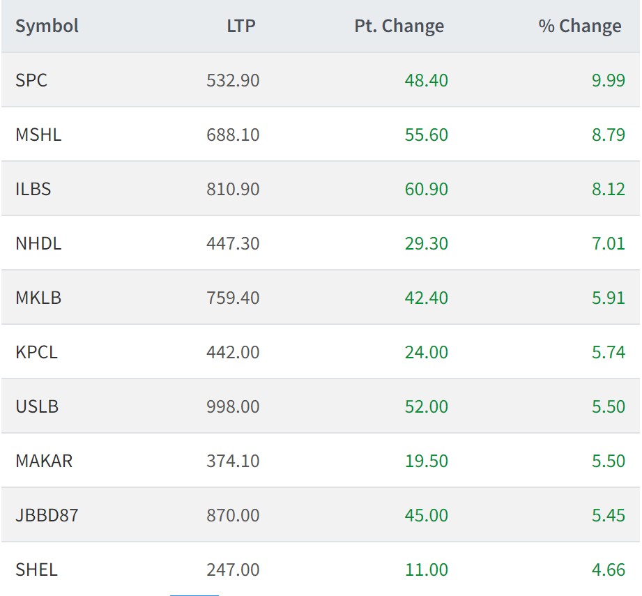 यस दिन मिड सोलु हाइड्रोपावर र इन्फिनिटी लघुवित्तको क्रमशः ८.७९ र ८.१२ प्रतिशतले बढेको छ । त्यस्तै, नेपाल हाइड्रो डेभलपमेन्ट, मनकामना स्मार्ट लघुवित्त, कालिका पावर कम्पनी, उन्नति सहकार्य लघुवित्त, मकर जितुमाया सुरी हाइड्रोपावर, ज्योति विकास बैंक बोण्ड २०८७ र सिंगटी हाइड्रो इनर्जीको शेयरमूल्य सर्वाधिक बढेको छ ।