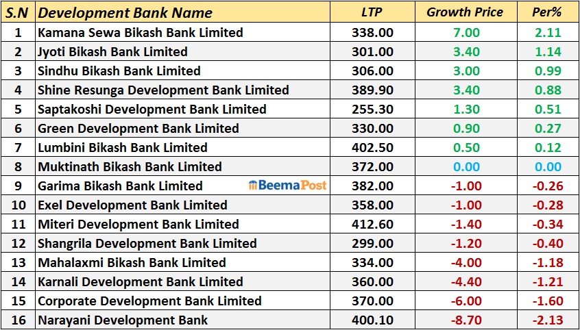 ७ विकास बैंकको शेयरमूल्य बढ्यो, बाँकीको गिरावट (एलटीपीसहित)