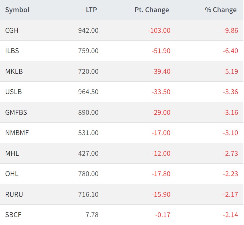 यस दिन इन्फिनिटी लघुवित्त, मनकामना स्मार्ट लघुवित्त, उन्नति सहकार्य, गणपति लघुवित्त, एनएमबि माइक्रोफाइनान्स वित्तीय संस्था, मन्दाकिनी हाइड्रोपावर, ओरिएन्टल होटल, रु रु जलविद्युत परियोजना र सनराइज ब्लूचिपको शेयरमूल्य सर्वाधिक घटेको छ ।