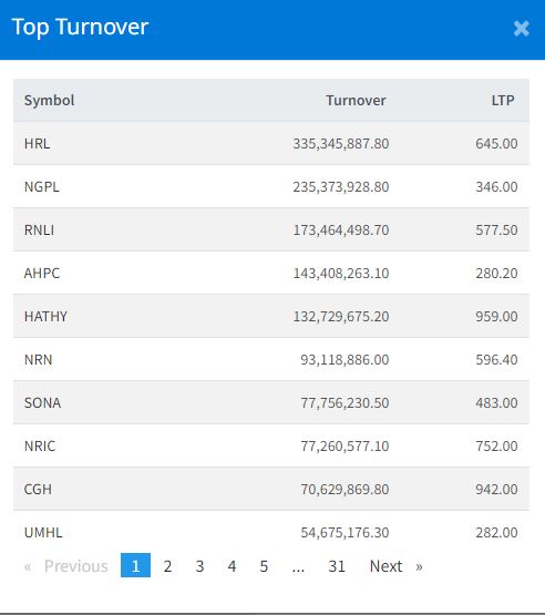 आज न्यादी ग्रुप पावरको २३ करोड ५३ लाख रुपैयाँ, रिलायबल नेपाल लाइफको १७ करोड ३४ लाख रुपैयाँ र अरुण भ्याली हाइड्रोपावरको १४ करोड ३४ लाख रुपैयाँको कारोबार भएको छ ।