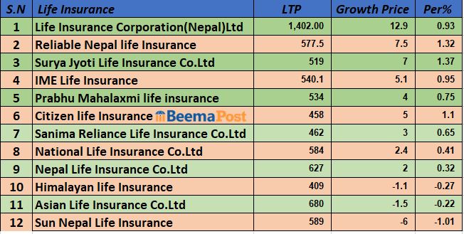 जीवन बीमा तर्फ ९ कम्पनीको मूल्य बढेको छ भने ३ कम्पनीको सेयर मूल्य घटेको हो । आज जीवन बीमातर्फ एलआइसी नेपालको सेयर मूल्य सर्वाधिक बढेको हो । कम्पनीको सेयर प्रतिकित्ता १२ रुपैयाँ ९ पैसाले बढेको हो ।