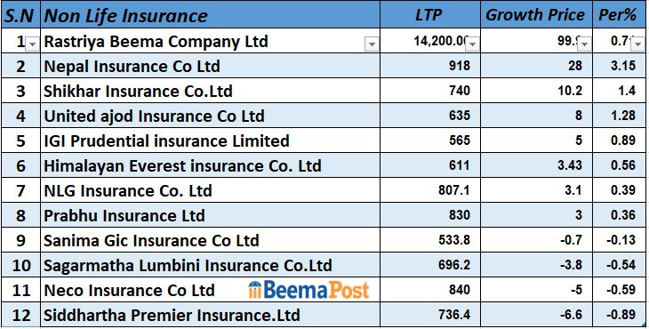 निर्जीवन बीमा तर्फ ८ कम्पनीको सेयर मूल्यमा सुधार आउँदा ४ कम्पनीको मूल्य भने घटेको हो । आज राष्ट्रिय बीमा कम्पनीको सेयर सर्वाधिक प्रतिकित्ता ९९ रुपैयाँ ९ पैसाले बढेको हो ।
