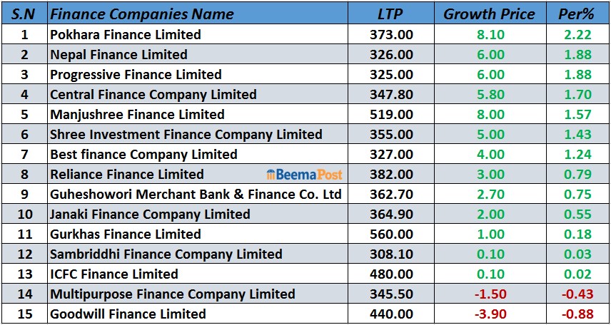 आज पोखरा फाइनान्स कम्पनीको सर्वाधिक २.२२ प्रतिशतले शेयरमूल्य बढेको छ । यस दिन ७ कम्पनीहरुको शेयरमूल्य १ प्रतिशतभन्दा बढीले बढेको हो । त्यस्तै, गुडविल फाइनान्स र मल्टिपर्पस फाइनान्स कम्पनीको शेयरमूल्य भने क्रमशः ०.८८ र ०.४३ प्रतिशतले घटेको छ ।