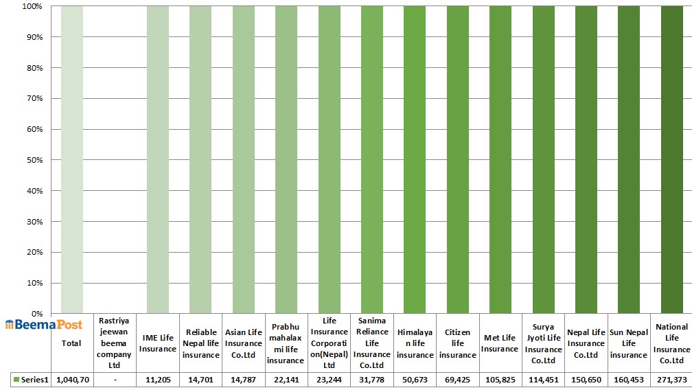 सिटिजन लाइफ इन्स्योरेनस कम्पनीको ६ करोड ९४ लाख रुपैयाँ, हिमालयन लाइफको ५ करोड रुपैयाँ, सानिमा रिलायन्स लाइफको ३ करोड रुपैयाँ एलआईसीको ३ करोड रुपैयाँ, प्रभु महालक्ष्मी लाइफले २ करोड रुपैयाँ, एशियन लाइफले १ अर्ब रुपैयाँ, आइएमई लाइफले एक अर्ब रुपैयाँ एकल बीमाशुल्क आर्जन गरेका छन् ।
