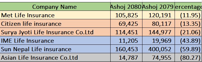 मेट लाइफको ११ प्रतिशत, सिटिजन लाइफको १३ प्रतिशत, सूर्य ज्योति लाइफको २१ प्रतिशत, आइएमई लाइफको ४३ प्रतिशत, सन नेपाल लाइफको ५९ प्रतिशत र एशियन लाइफको ८० प्रतिशतले एकल बीमाशुल्क आर्जन घटेको छ।