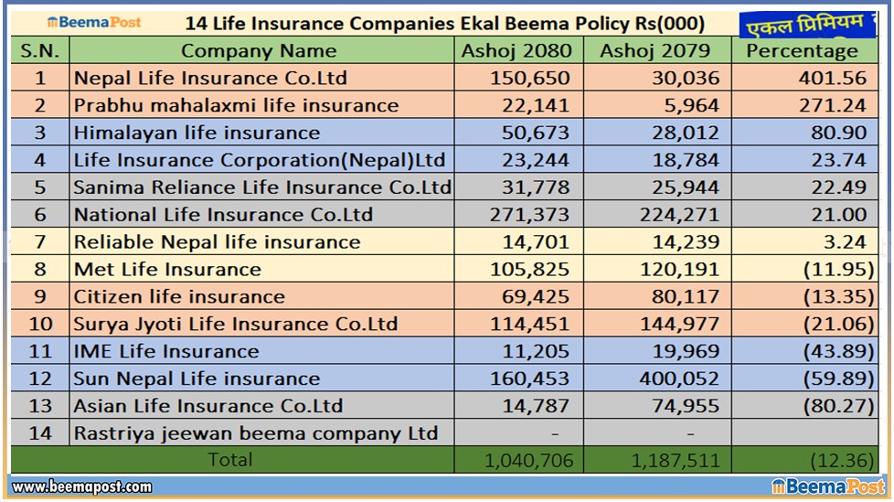१४ जीवन बीमा कम्पनीमध्ये राष्ट्रिय बीमा संस्थानको एकल बीमाशुल्क भने गरेको छैन भने चार बीमा कम्पनीको एकल बीमाशुल्क आर्जन बढेको र अन्य नौ वटा बीमा कम्पनीको भने घटेकोे तथ्यांकमा उल्लेख रहेको छ ।राष्ट्रिय जीवन बीमा कम्पनीले भने एकल बीमा पोलिसी बिक्रि नगर्ने कम्पनीमा पर्दछ ।