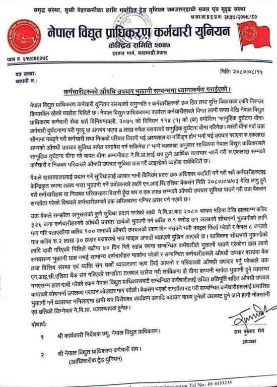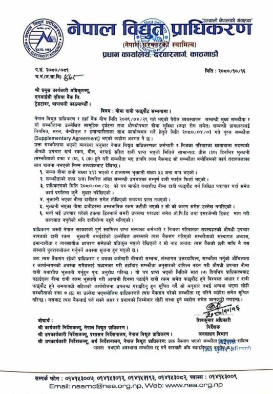 प्राधिकरणले त्यहाँ कार्यरत कर्मचारीको दुर्घटना र उपचार बीमा एनआईसी एसियामा गर्ने सम्झौता भएको भए पनि बैंकबाट एकपक्षीय रुपमा सम्झौता पालना नभएको जनाएको हो ।