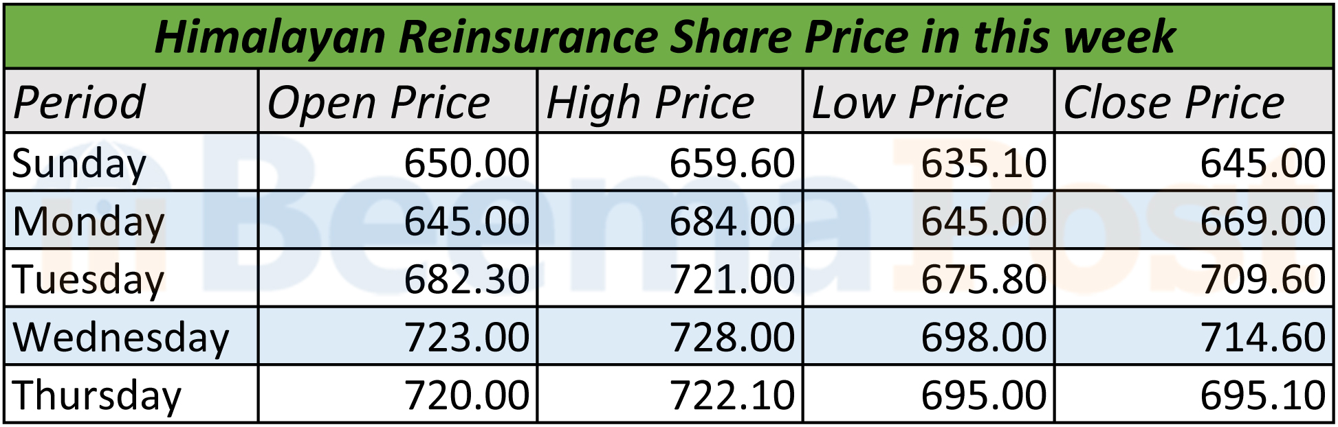 यस साताको पहिलो दिन आइतबार हिमालयन रिको शेयर कारोबार ६५० रुपैयाँमा खुलेको थियो । कारोबार समयभर तीव्र उचाचढाव भएको कम्पनीको शेयरमूल्य ६४५ रुपैयाँमा कायम भएर रोकिएको थियो ।