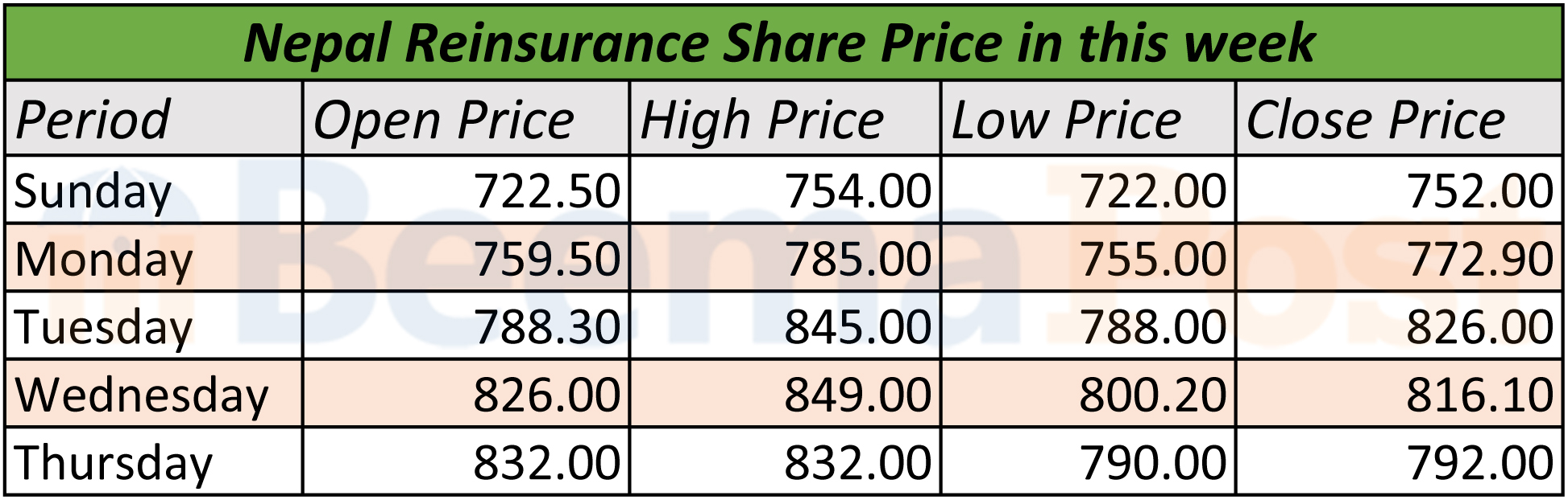 त्यसैगरी मंगलबार ७८८.३० रुपैयाँमा खुलेको शेयरकारोबार तीव्र उचारचढाव भई अन्त्यमा ८२६ रुपैयाँमा आएर रोकियो । बुधबार ८२६ रुपैयाँमा खुलेको कम्पनीको शेयर घटेर ८१६.१० रुपैयाँमा कायम भयो ।
