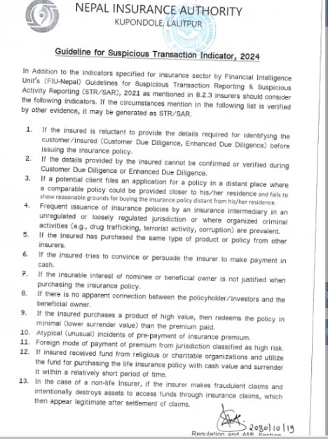 बीमा प्राधिकरणले बीमकले ग्राहक, कारोबार वा सम्पत्तिको सम्बन्धमा शंकास्पद गतिविधि देखिएमा वा ग्राहकले शंकास्पद गतिविधि गर्ने प्रयास गरेमा वित्तीय जानकारी इकाईलाइ शंकास्पद कारोबारको विवरण तोकिएको ढाँचामा पेश गर्न समेत निर्देशन दिएको छ।