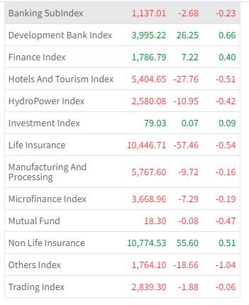 आज ९ उपसूचक राताम्य भएका छन् । आज बैंकिङ समूहको ०.२३ प्रतिशत, होटल तथा पर्यटन समूहको ०.५१ प्रतिशत र हाइड्रोपावर समूहको ०.४२ प्रतिशतले घटेको छ ।