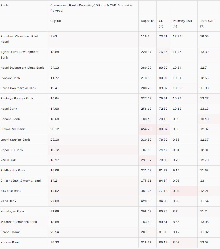 पुस मसान्तसम्मको तथ्यांक अनुसार आधा दर्जन बैंक ऋण दिनै नसक्ने अवस्थामा पुगेका छन् । कर्जा निक्षेप अनुपातका आधारमा अधिकांश बैंकहरूको ऋण लगानी गर्ने ठाउँ प्रशस्त भए पनि पूँजीकोषका कारण ऋण दिनै नसक्ने अवस्थामा पुगेका छन् ।