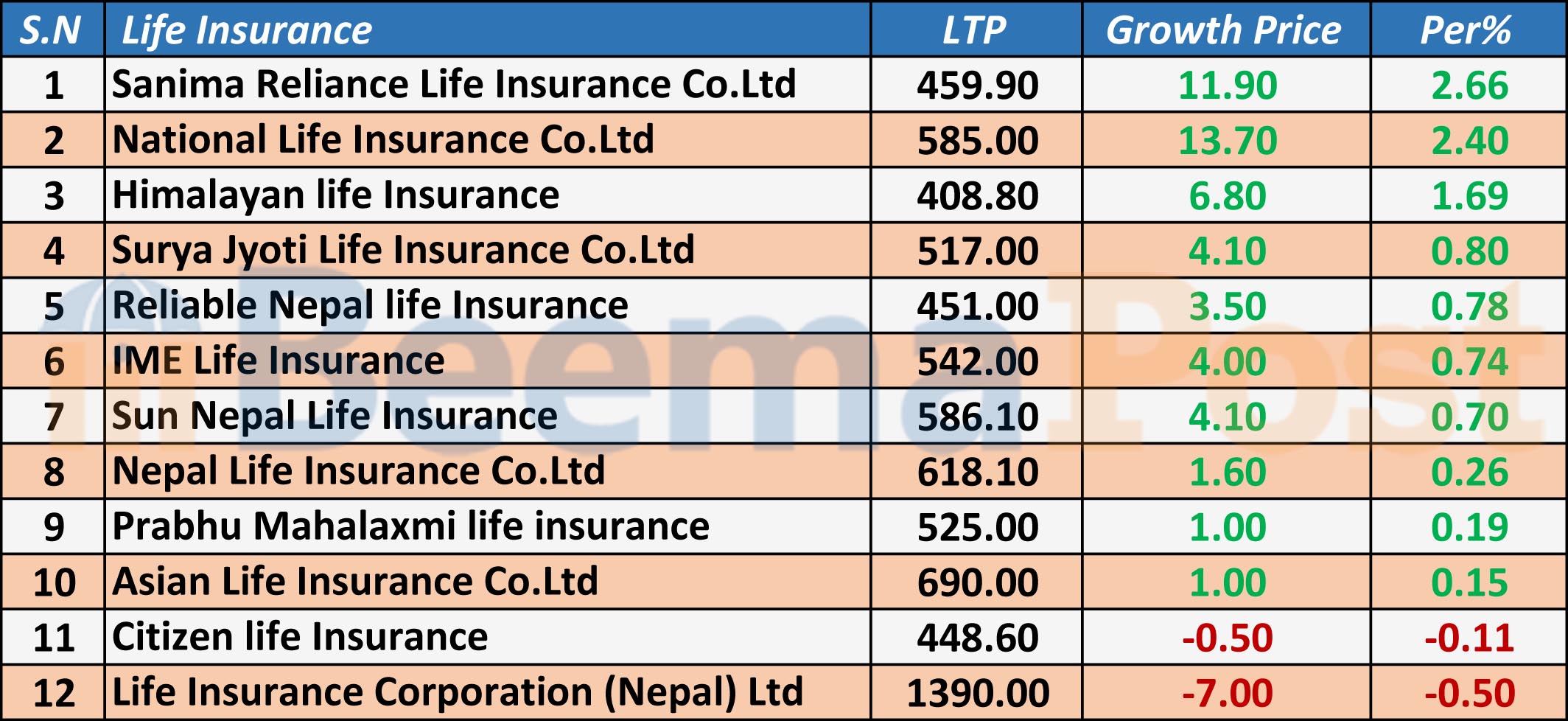 त्यस्तै, ८ बीमा कम्पनीहरुको शेयरमूल्य ५०० रुपैयाँमाथि रहेको छ। जसमध्ये लाइफ इन्स्योरेन्स कर्पाेरेशनको एक हजार ३९०, एशियन लाइफको ६९० र नेपाल लाइफको ६१८.१० रुपैयाँ रहेको छ।